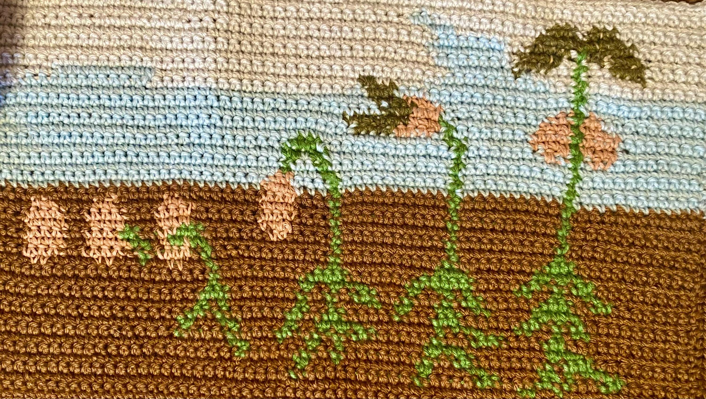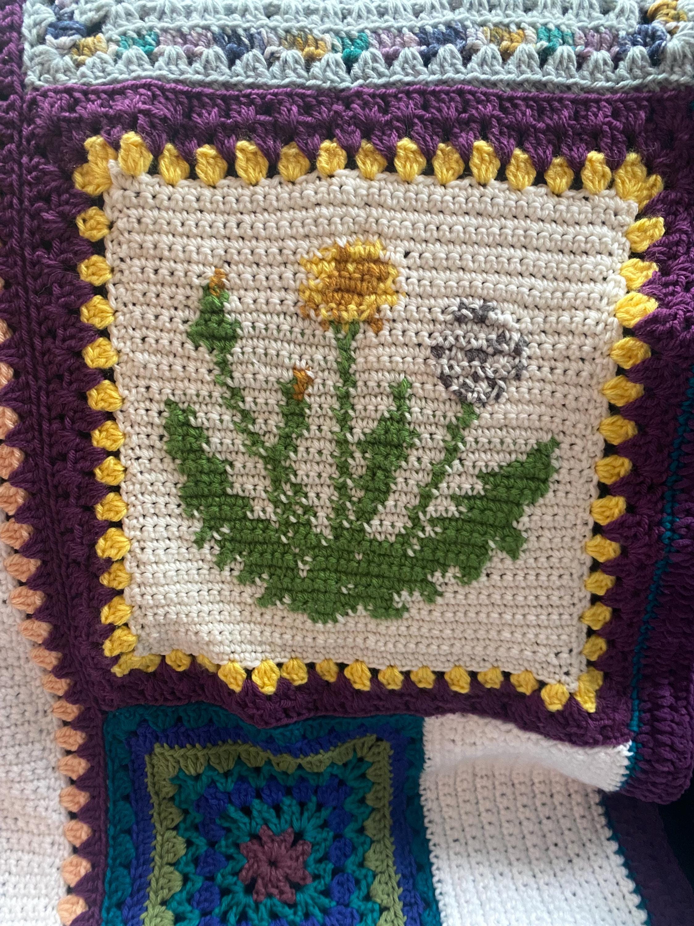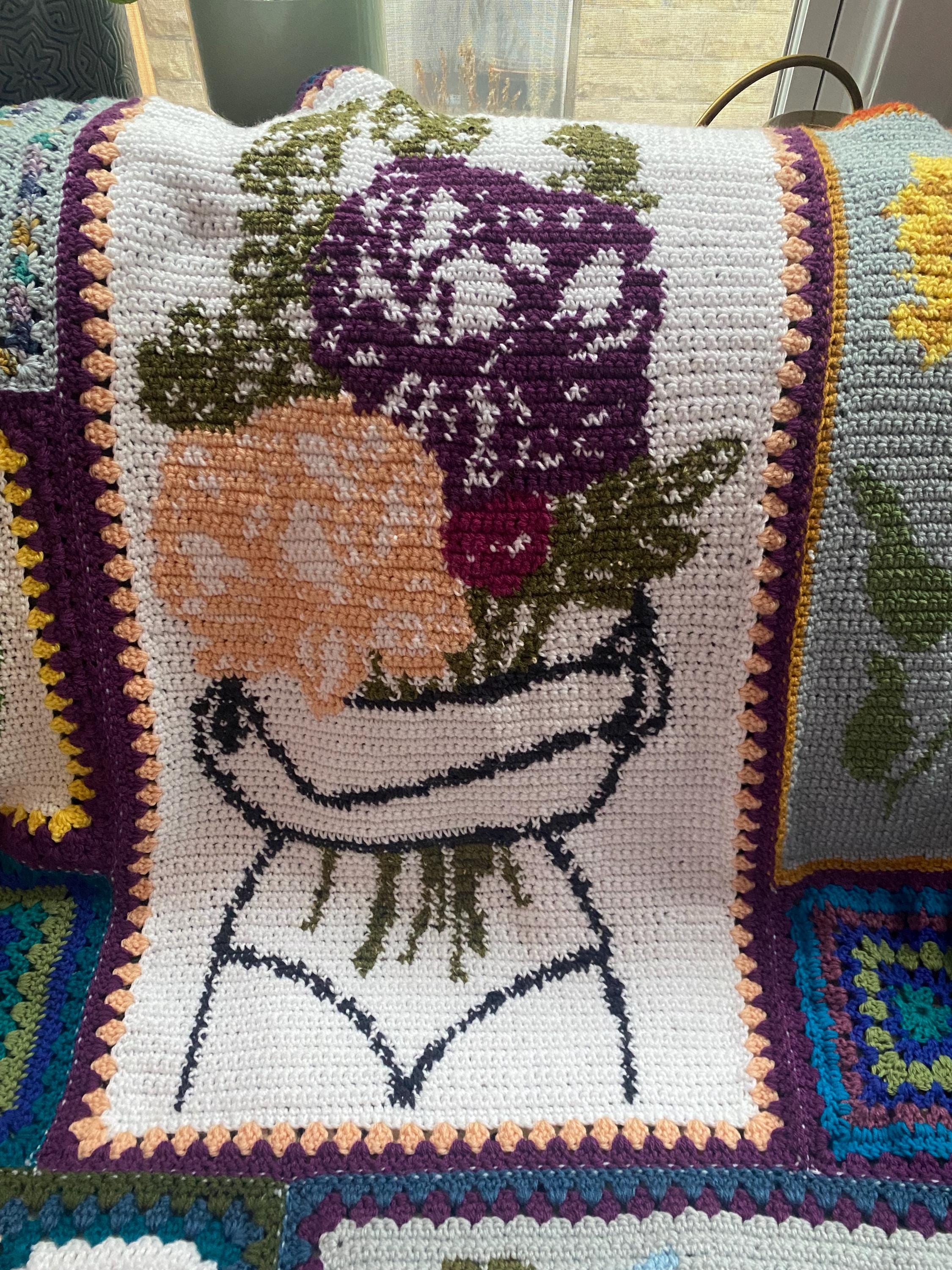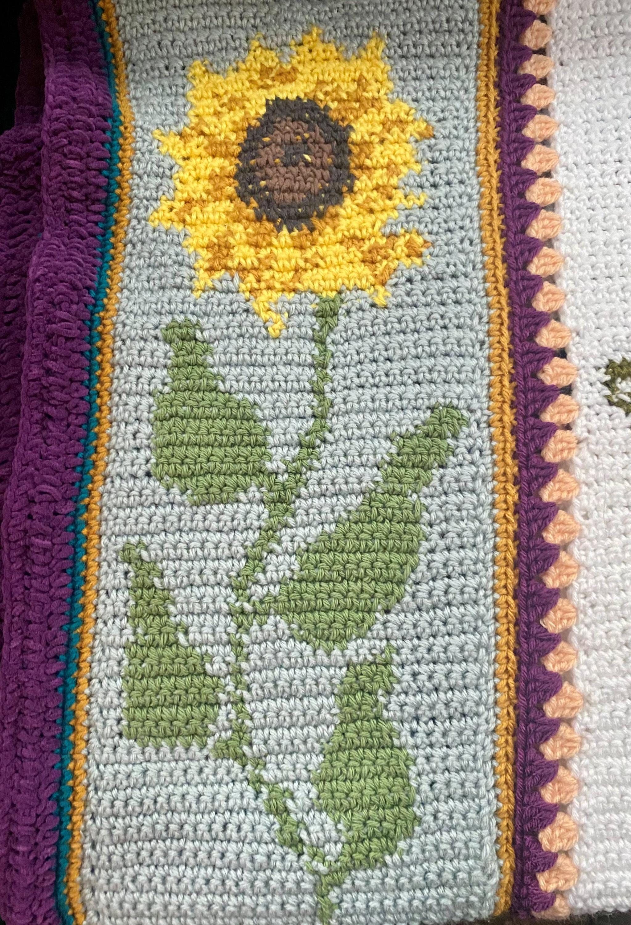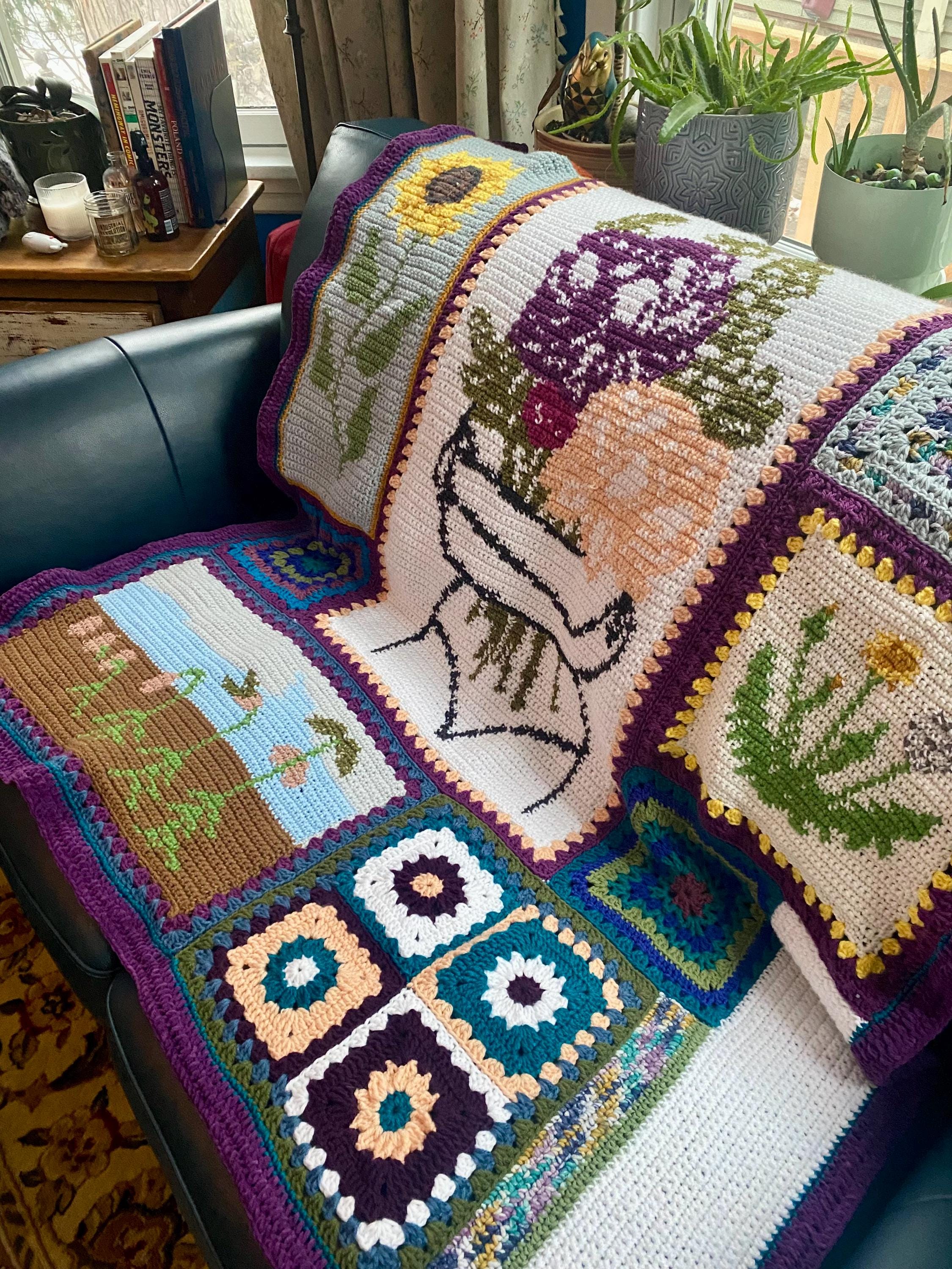 A garden, but make it graphic. Flowers Throw is a bold, artful lapghan built from a series of crocheted panels — sunflowers, wild stems, a silhouette bursting with blooms, a quiet landscape of seedlings reaching skyward. It reads like a stitched sketchbook: part botanical study, part color experiment, part cozy object.